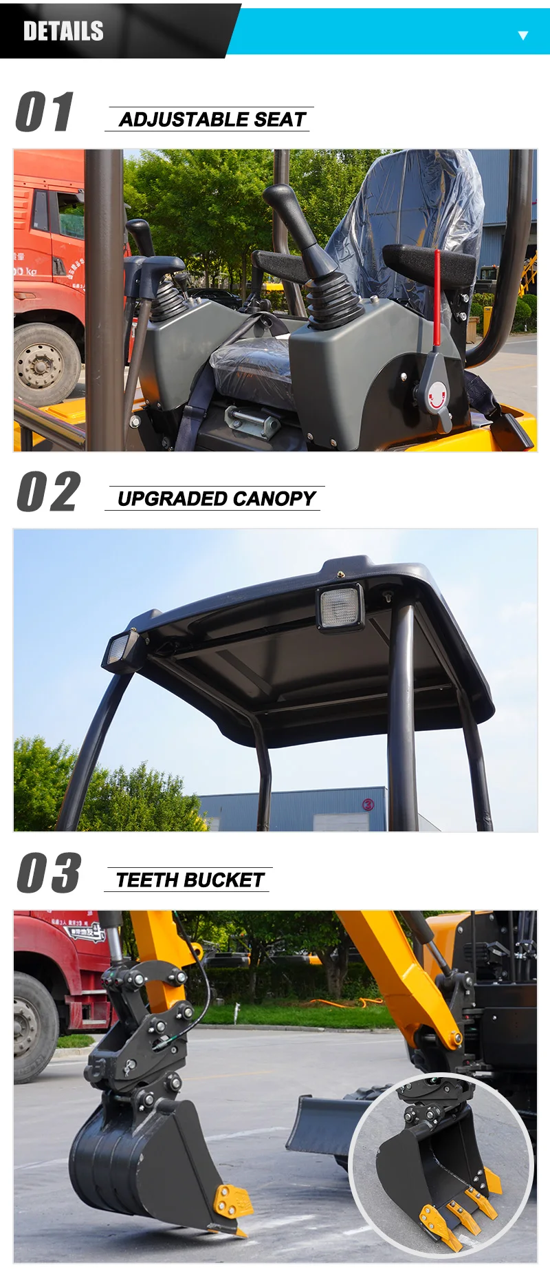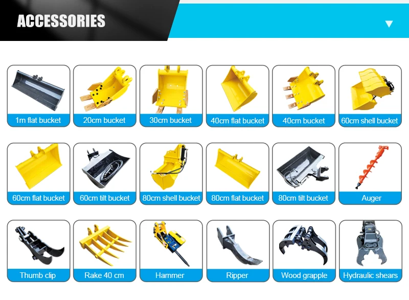 Standard Attachments: 40cm, 60cm, 80cm, 1m flat bucket; 20cm, 30cm, 40cm tooth bucket. Please contact us for customization of special size digging bucket.